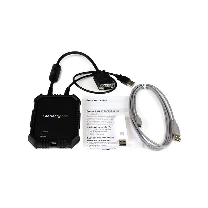 Este resistente adaptador portátil de crash cart USB le permite convertir su laptop en consola portátil para acceder a servidores, computadoras de escritorio y laptops, terminales ATM, quioscos o cualquier dispositivo informático con puertos tanto VGA, como USB.